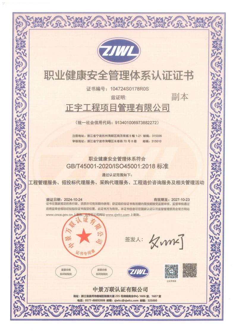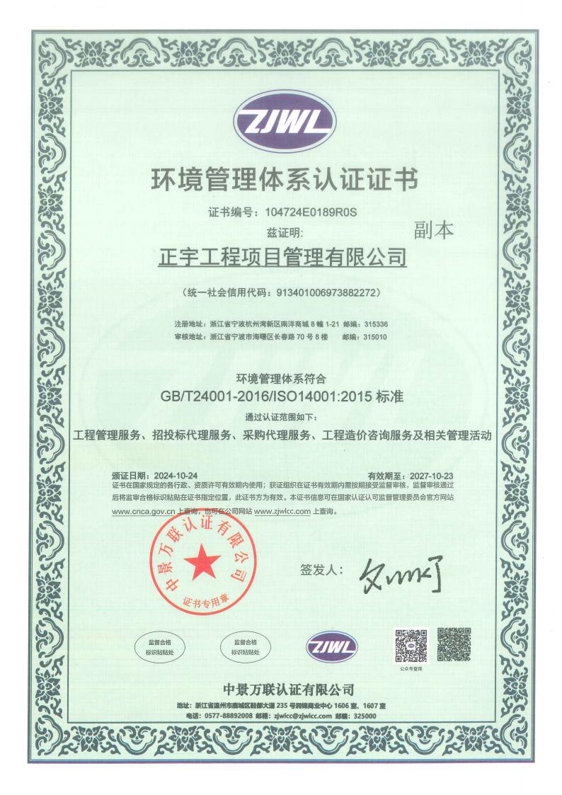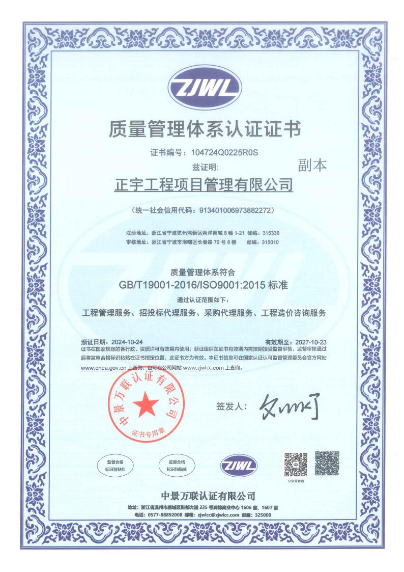 正宇工程項目管理有限公司成立于2009年,注冊資金6080萬,注冊地為浙江省寧波市杭州灣新區(qū)。公司擁有國家住建部頒發(fā)的工程造價企業(yè)甲級資質(zhì)、招標(biāo)代理資質(zhì)等等;是一家專業(yè)從事工程項目管理、企業(yè)管理、政府采購代理服務(wù)、招投標(biāo)代理服務(wù)、信息技術(shù)咨詢服務(wù)及其他技術(shù)服務(wù)的綜合型工程咨詢公司。
